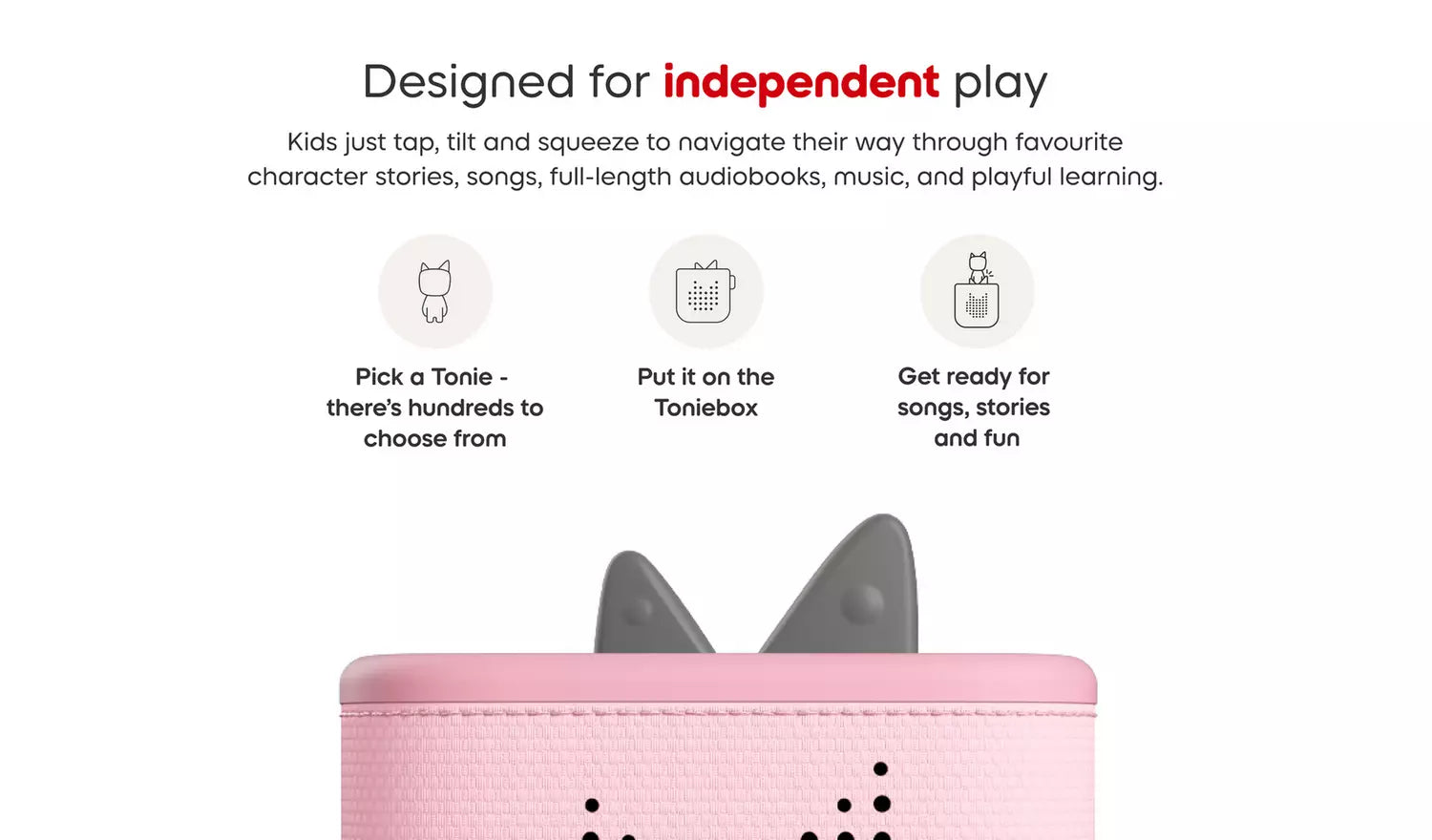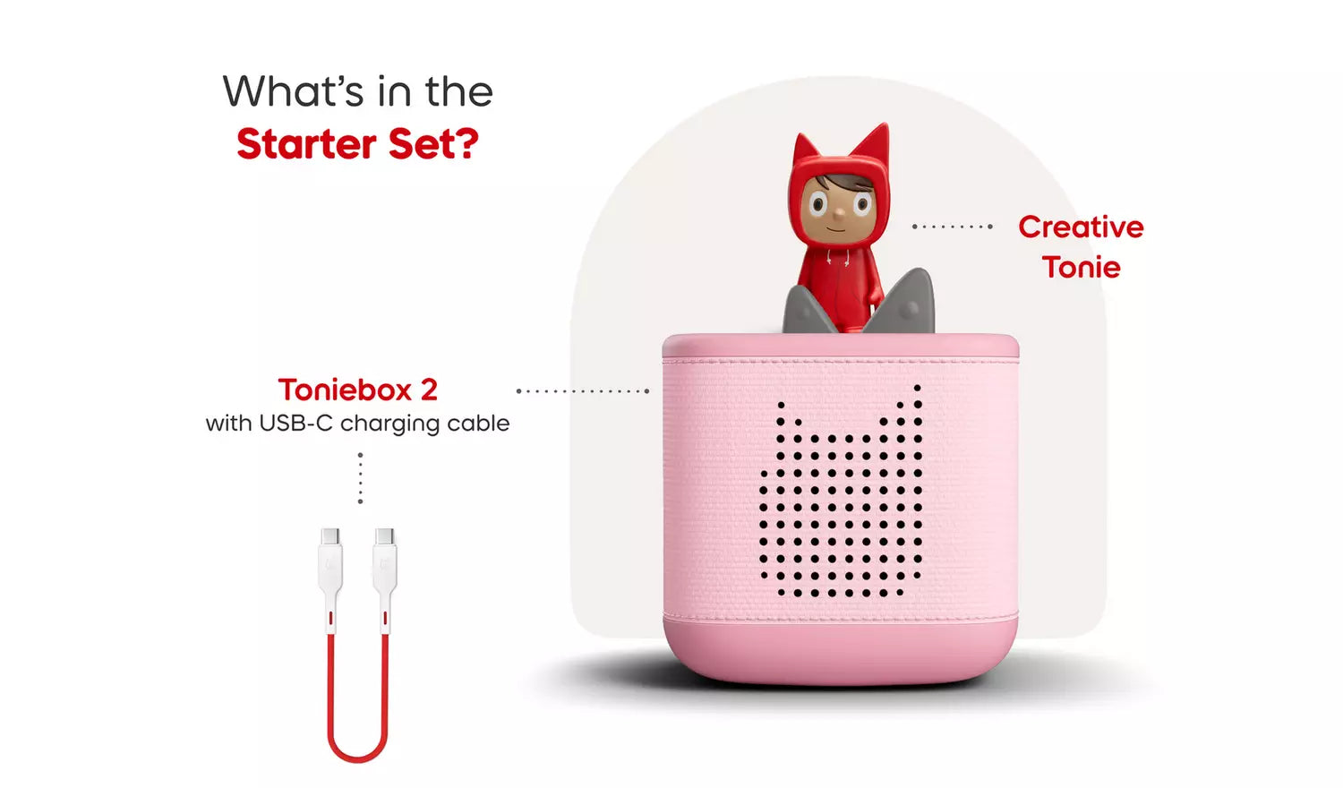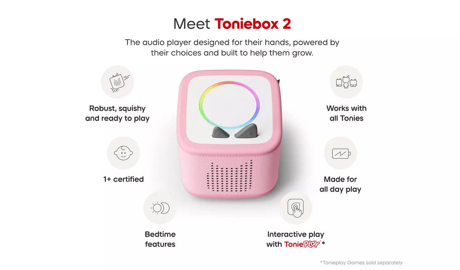 Toniebox 2 is the kid-powered audio player, made for ages 1-9+. No screens, no ads. Kids can dive into their favourite stories and songs with an ever-growing crew of Tonie characters. Just pop one on the Toniebox and go! Or, unlock interactive games, quizzes, and challenges where they take the lead with Tonieplay. New bedtime features help them build better sleep habits. This Starter Set includes a Creative Tonie with space for up to 90 minutes of custom audio. Listen, play and grow in a whole new way.
