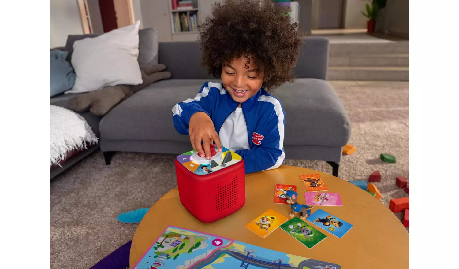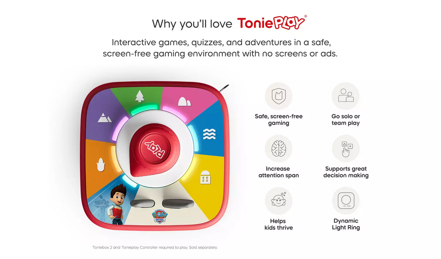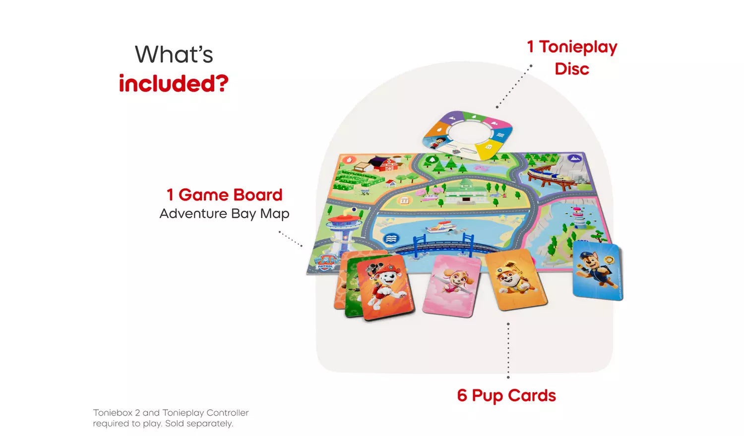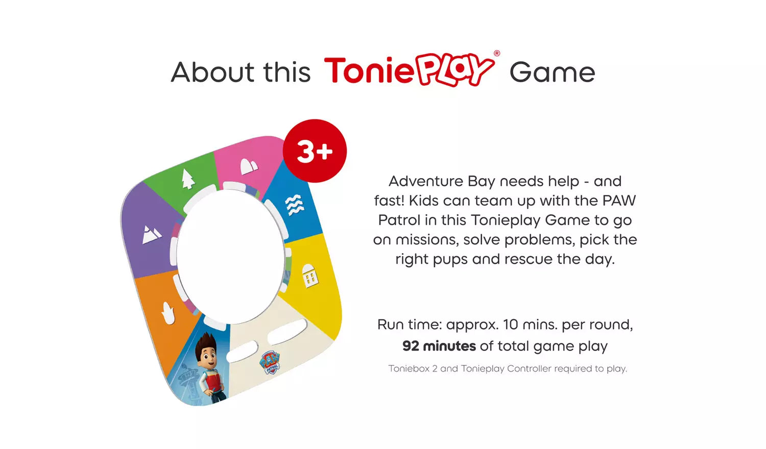 Ryder's Pup Pad is buzzing and Adventure Bay needs help! In this Tonieplay Game, kids join the PAW Patrol for 6 action-packed missions and over 10 mini games. They'll use the map to track calls, choose the right pup using the Pup Cards, make decisions, and work together to solve problems all across town. Tonieplay unlocks new ways to play, only on Toniebox 2. Little pups just put the Tonieplay Disc and Tonieplay Controller on the Toniebox 2, and get ready to roll!